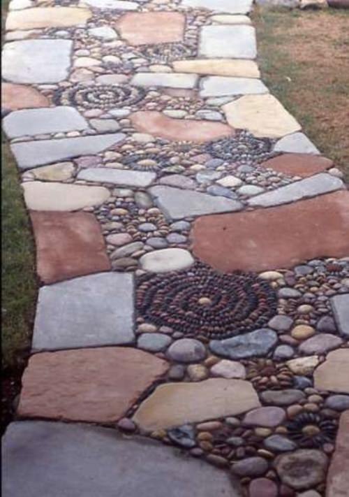 У нас на даче выложены дорожки из больших булыжников, а именно плитняка, который мы натаскали сами с ближайшей речки. Но со временем дорожки расползлись и немного потеряли вид. Почва, в которую они вкопаны — земля. Сверху дорожка засыпана песком. Когда будем переделывать, хочется сделать надежно на века. Как это посоветуете сделать? Залить все бетоном не вариант, это некрасиво.