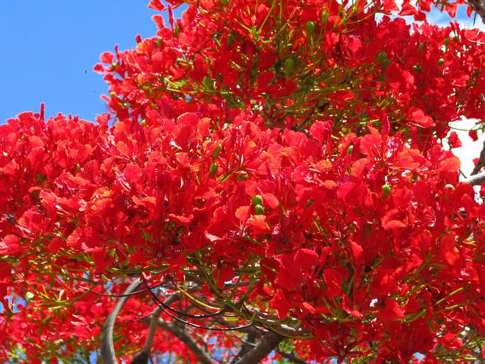 Здравствуйте, уважаемые любители ландшафтного дизайна и профессионалы! Недавно мельком увидела то ли рекламу, то ли передачу о красивом дереве. Единственное, что о нем запомнила, это то что в названии были слова “королевское дерево” и что это самое красивое из цветущих деревьев мира. На фото — или видеосъемке дерева в цвету создавалось ощущение, что у него цветы расположены по всей кроне, листьев вообще не видно было — сплошь красные цветы плотным слоем. Помогите определить что это за дерево и возможно ли его вырастить в уральском климате? Хотелось бы вырастить его в своем саду. Ну очень запало в душу!