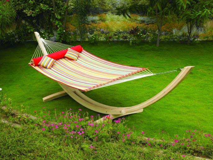 Раньше гамаки напоминали обычную волейбольную сетку. Сейчас есть много усовершенствованных вариантов. Достаточно научиться технике «макраме» и можно самостоятельно выполнить красивое и удобное изделие.